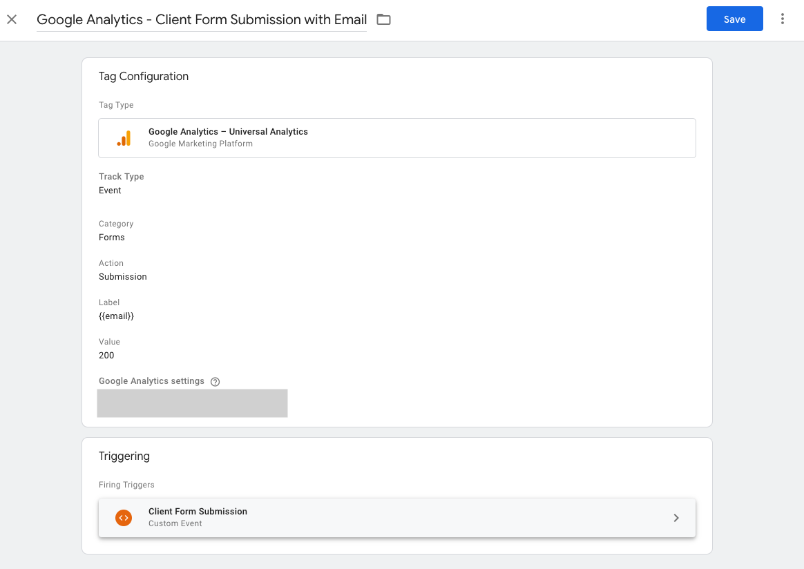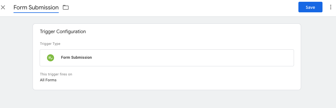 Important: If you are using a web library where events don’t bubble to the root of the document (e.g. React), then you will have to manually push the event data into the window.dataLayer. Otherwise the Google Tag Manager ‘Form Submission’ event won’t bubble up to the DOM root, and therefore Google Tag Manager will never register it. In that case the ‘Trigger’ should be of type ‘Custom Event’, then use the code below that runs after successful form submission.